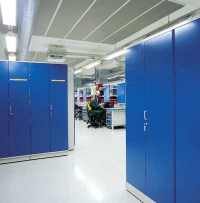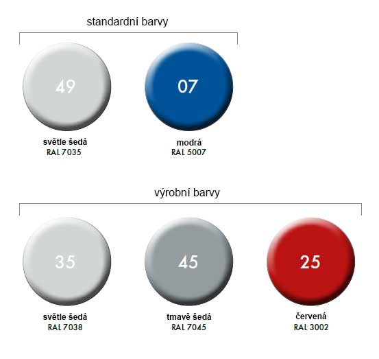 Pracovní stoly, skříně, regály, zásuvkové jednotky a rámy vozíků jsou světle šedé RAL 7035. Mimo tuto standardní barvu můžeme nabídnout další barvy.