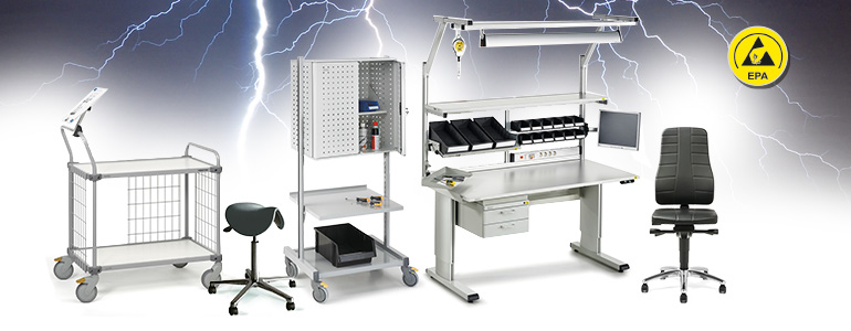 "Veškeré příslušenství pracovního stolu, díky kterému je stůl plně funkční a ergonomický, představuje pro ESDS součástky potenciál rizika. Musí být proto také chráněno proti elektrostatickému výboji."
