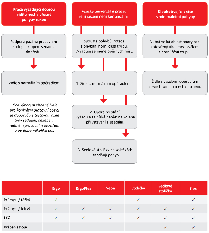 Ergonomické požadavky na pracovní židle v průmyslovém a technickém prostředí jsou od své podstaty odlišné od jiných oblastí, jako jsou např. kanceláře. Práce prováděné při výrobě mohou zahrnovat sílu, přesnost a opakující se pohyby a není vždy možné zaujmout ideální pozici vzhledem k pracovišti.