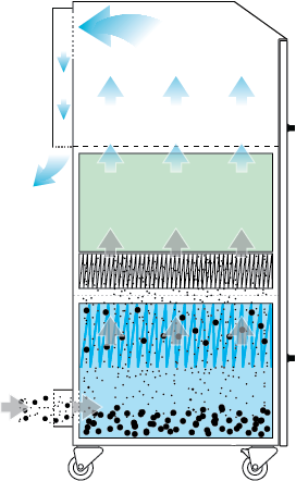 Technologie reverzního průtoku vzduchu způsobuje pokles rychlosti vzduchu a změnu jeho směru. Větší částice vypadávají z hlavního proudu vzduchu rovnou do filtrační komory. S menším objemem částic se proto životnost filtru zásadně prodlužuje. Znečištěný vzduchu vstupující do komory na větší částice je veden kolmo přes filtry.